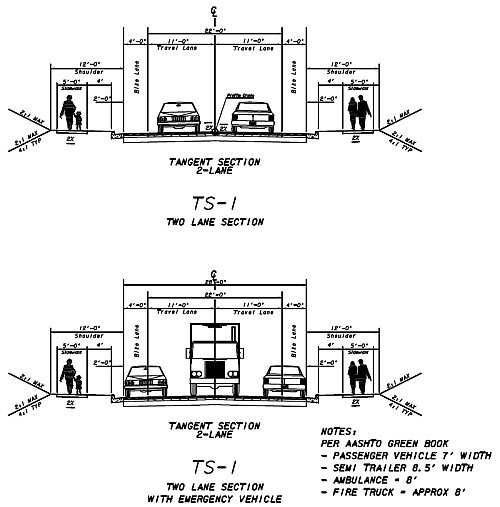 Below are drawings for Mount Vernon Rd with 11 ft lanes and 4 ft "bike lanes" and a foot and half gutter on each side for a total of 33 feet curb to curb.